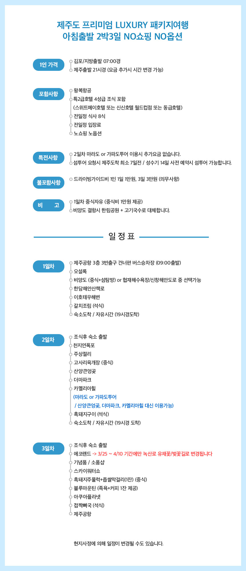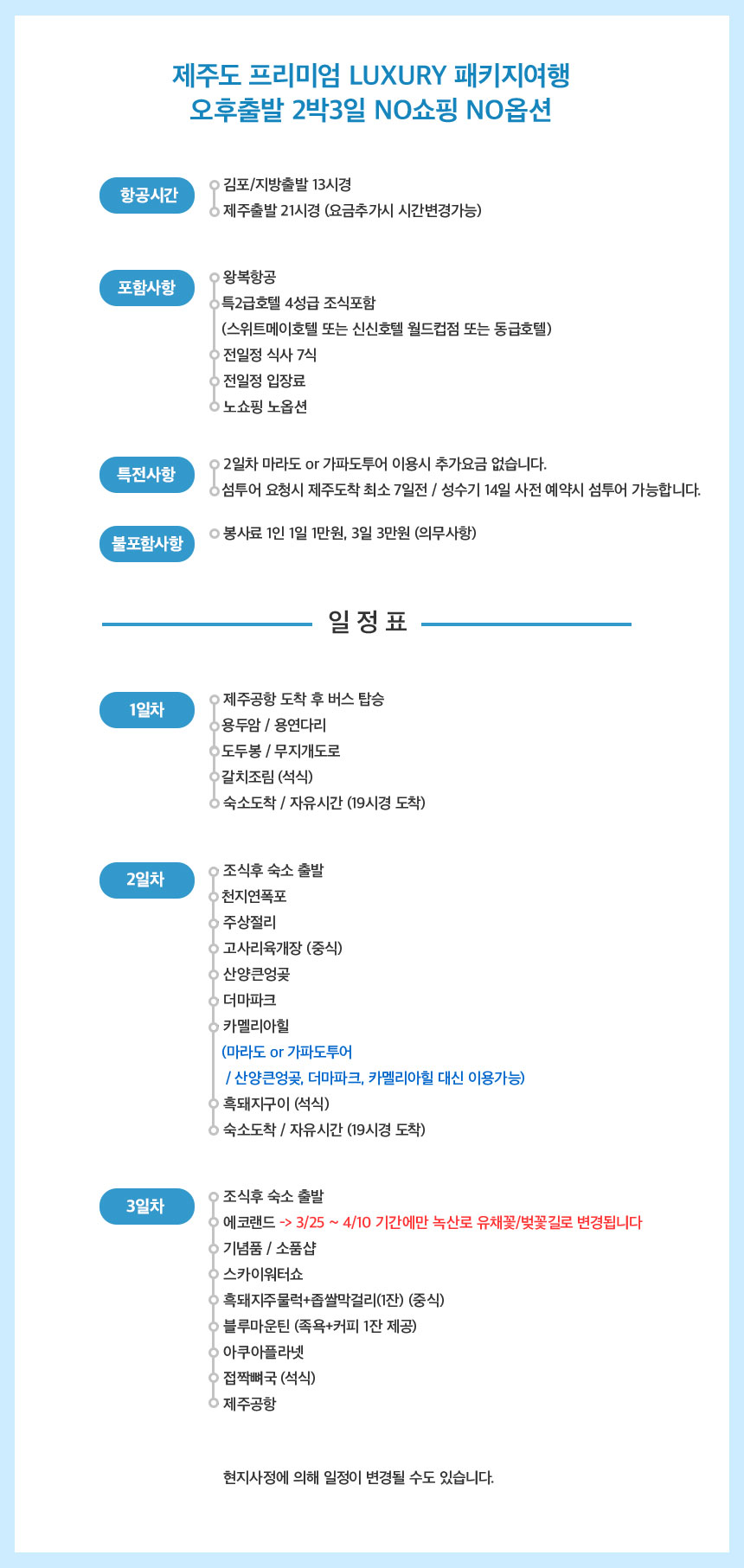 | 취소 or 날짜변경 환불규정을 꼭 확인 - 구매후 - 여행 16일전까지 1인 60,000원 - 여행 15일전 ~ 8일전 총금액의 50% - 여행 7일전 ~ 4일전 총금액의 70% - 여행 3일전 ~ 2일전 총금액의 90% - 여행 1일전 100% -18시 이후 or 주말, 공휴일은 취소가 되지 않습니다. 본 패키지 상품은 6인 이상 모객 시 출발하는 상품입니다. 출발인원 미충족 시 여행약관 제14조에 따라 여행 출발 48시간 이전에 여행계약을 일방적으로 취소될 수 있는 여행상품입니다. |