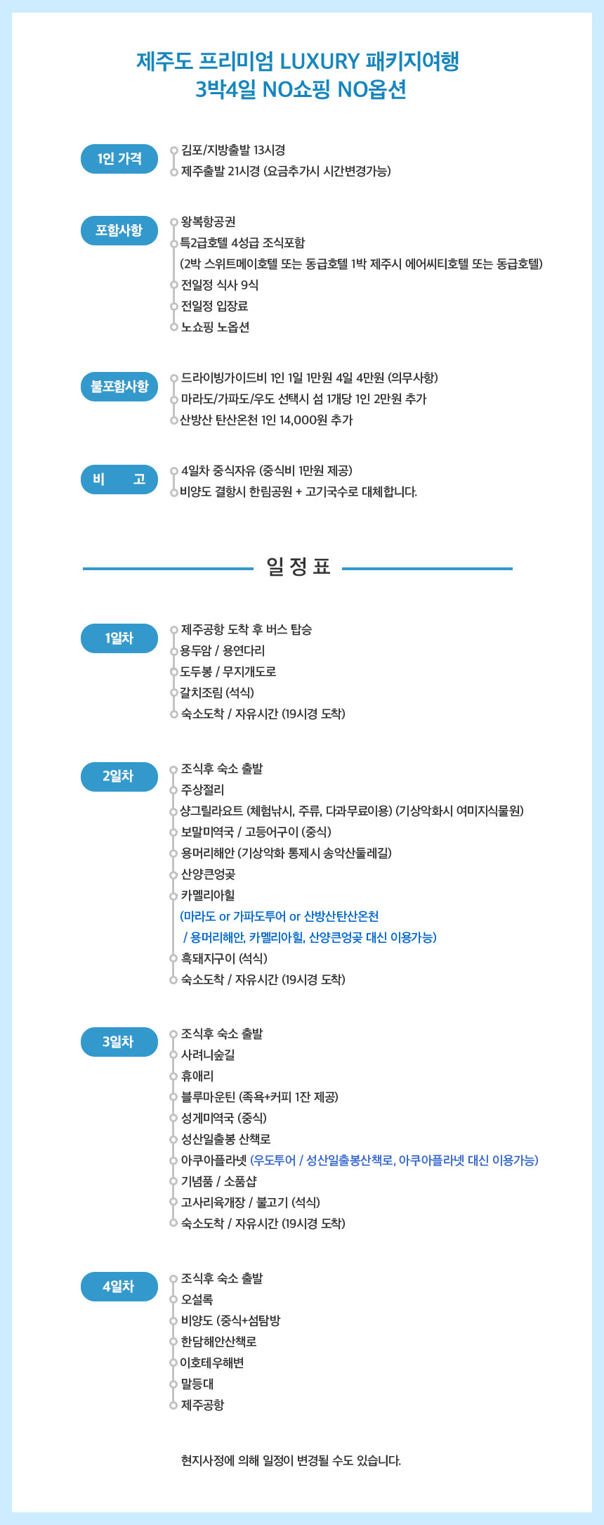 취소 or 날짜변경 환불규정을 꼭 확인 - 출발일자 기준 - 여행개시 16일전까지 1인 60,000원 - 여행개시 15 ~ 8일전 총금액의 50% - 여행개시 7일 ~ 4일전 총금액의 70% - 여행개시 3일 ~ 2일전 총금액의 90% - 여행개시 1일전 100% -18시 이후 or 주말, 공휴일은 취소가 되지 않습니다. 본 패키지 상품은 6인 이상 모객 시 출발하는 상품입니다. 출발인원 미충족 시 여행약관 제14조에 따라 여행 출발 48시간 이전에 여행계약을 일방적으로 취소될 수 있는 여행상품입니다. |