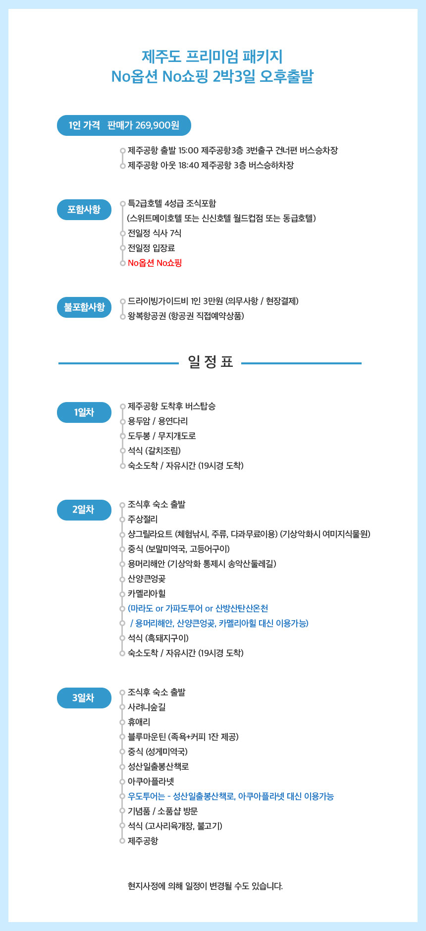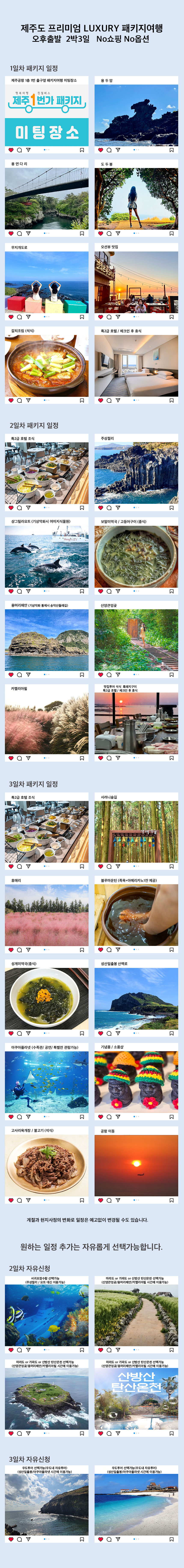취소 or 날짜변경 환불규정을 꼭 확인 - 출발일자 기준 - 여행개시 16일전까지 1인 60,000원 - 여행개시 15 ~ 8일전 총금액의 50% - 여행개시 7일 ~ 4일전 총금액의 70% - 여행개시 3일 ~ 2일전 총금액의 90% - 여행개시 1일전 100% -18시 이후 or 주말, 공휴일은 취소가 되지 않습니다. 본 패키지 상품은 6인 이상 모객 시 출발하는 상품입니다. 출발인원 미충족 시 여행약관 제14조에 따라 여행 출발 48시간 이전에 여행계약을 일방적으로 취소될 수 있는 여행상품입니다. |